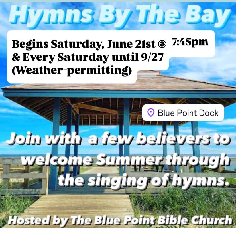 We also have our Summer Saturdays of Hymns At The Bay at 7:45pm (correction to former time provided) at the Blue Point Dock (at the end of Blue Point Ave. in Blue Point). See attached graphic.
