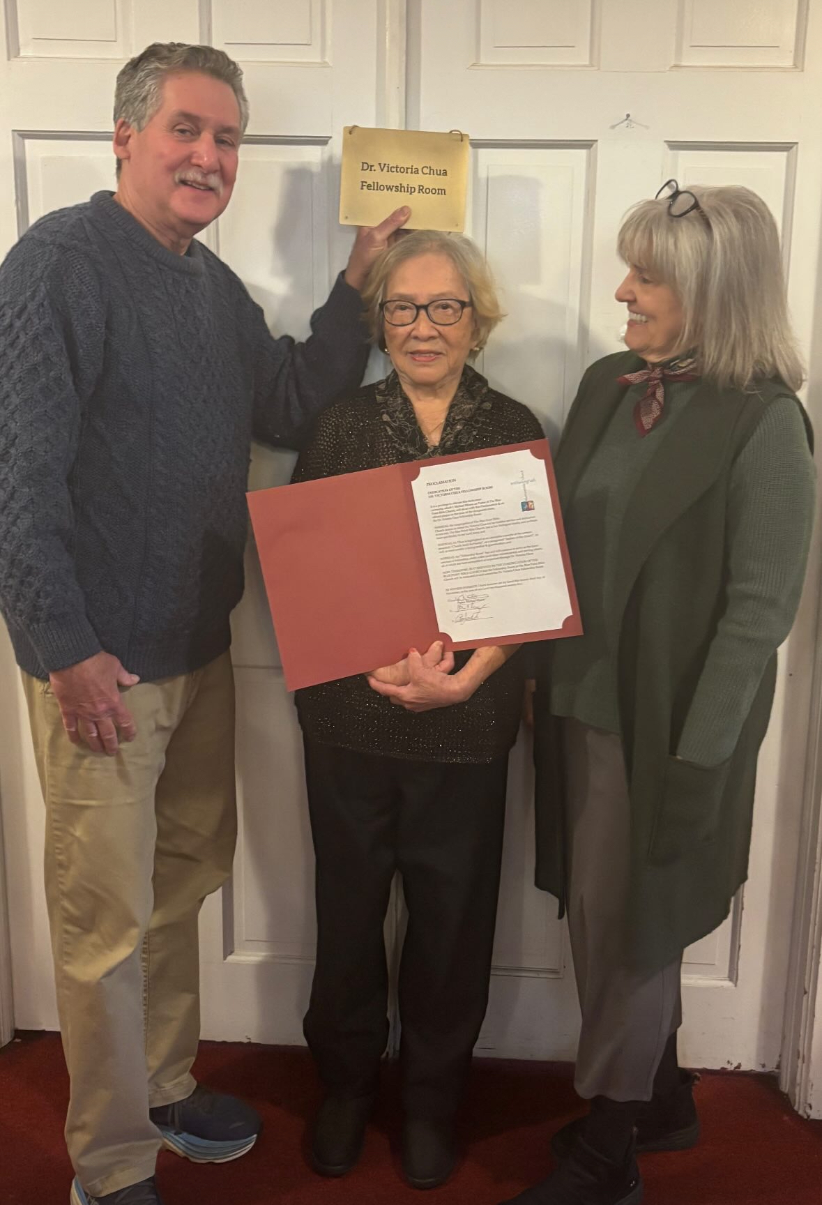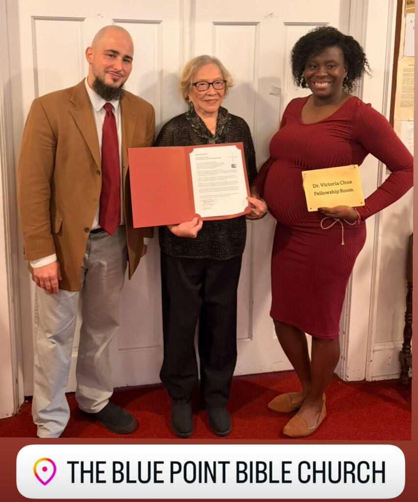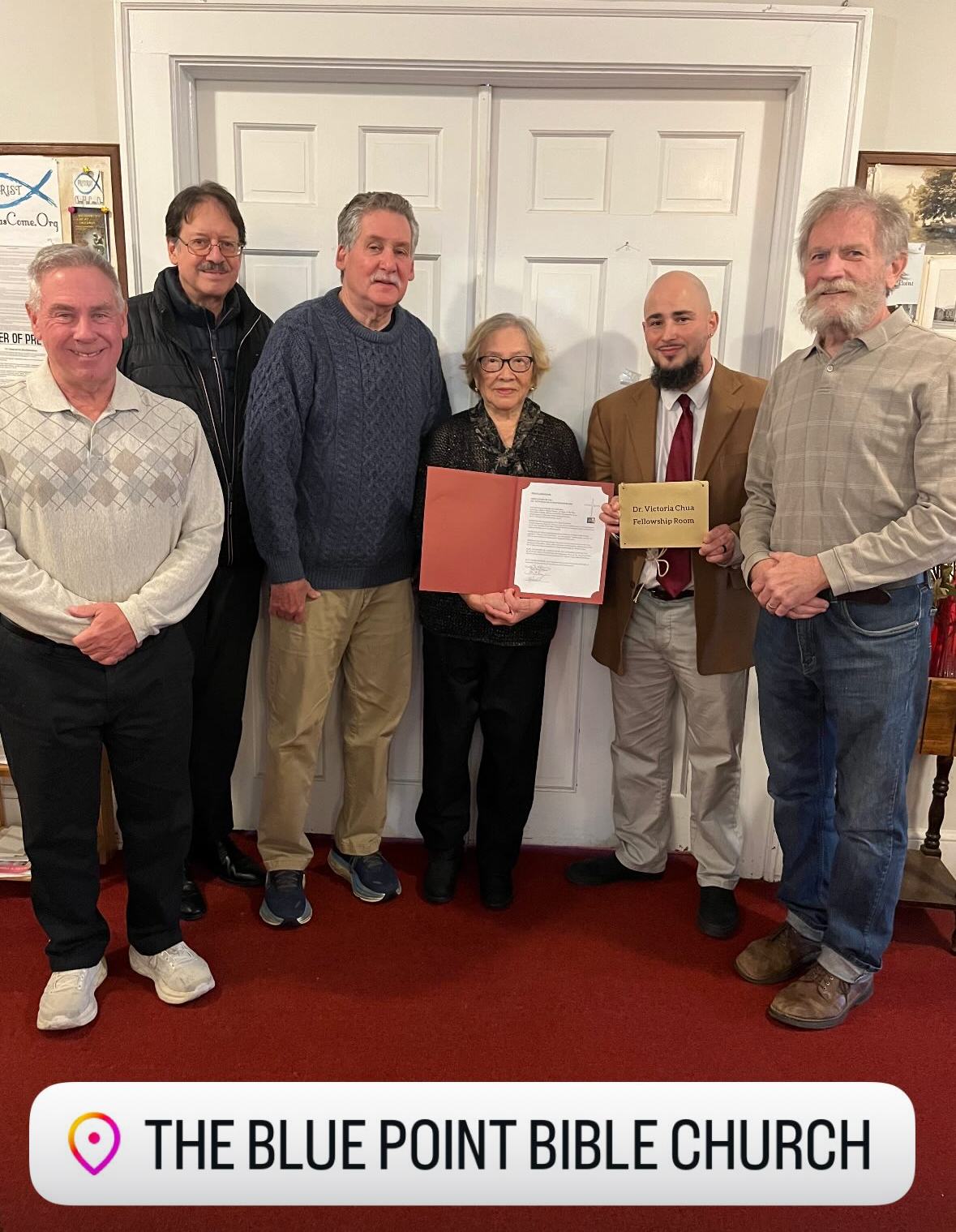 On Sunday, November 23rd, 2025, The Blue Point Bible Church, a historic church located in Blue Point, New York, honored long-time member, Dr. Victoria Chua, with a proclamation and a plaque officially designating the Dr. Victoria Chua Fellowship Room.