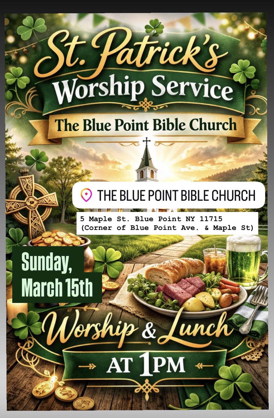 Tomorrow, Sunday, March 15th we will be doing things a bit different at The Blue Point Bible Church. We are suspending our morning worship service, encouraging folks to get out and enjoy the BBP St. Patrick’s Day parade & festivities, and then join us for Worship & Lunch (corned beef, cabbage, potatoes, & carrots) at 1pm. All welcome! See & share the attached graphic.